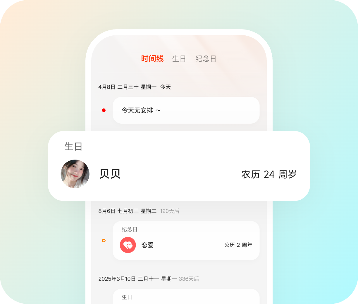 记录亲朋好友的生日和纪念日,通过时间线管理让您一目了然,不错过每一个重要的日子