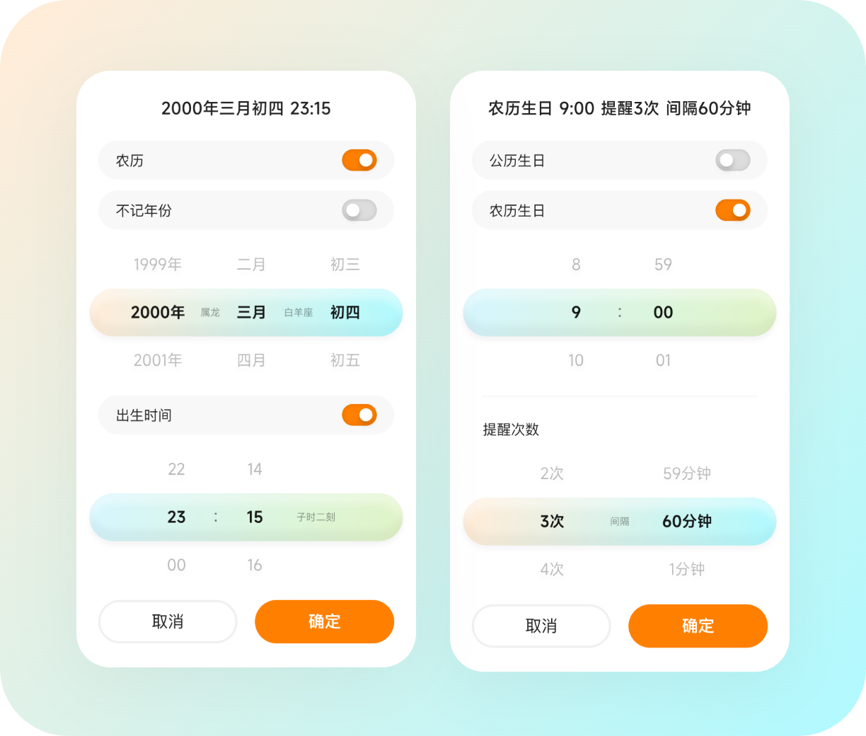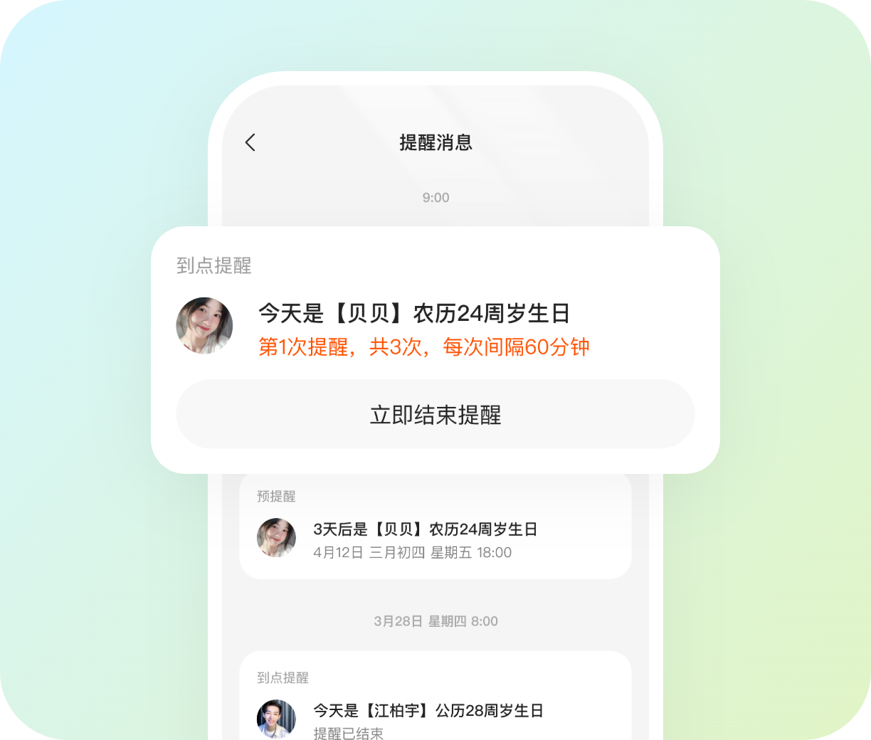 您可以自由的开启公历、农历生日/纪念日的提醒,也可以自定义提醒时间和频率